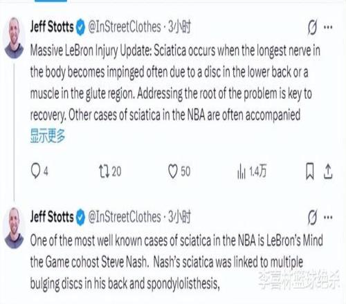 医学专家杰夫·斯托茨解析了詹姆斯的伤情,他在推特上写道:“勒布朗重伤更新:坐骨神经痛是指身体最长的神经受到压迫产生疼痛,通常是由于腰椎间盘或臀部肌肉受损所致。解决问题的根源是康复的关键。NBA中的其他坐骨神经痛的病例往往持续相当长的时间。”