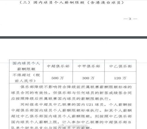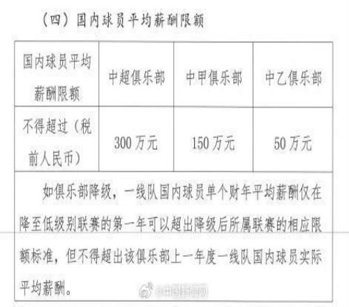 中国足球职业联赛联合会发布关于印发中国足球职业联赛俱乐部财务约定指标的通知。通知规定:国内球员年薪限额分别为500万(中超)、300万(中甲)和120万(中乙);国内球员平均薪酬分别为300万(中超)、150万(中甲)和50万(中乙)。