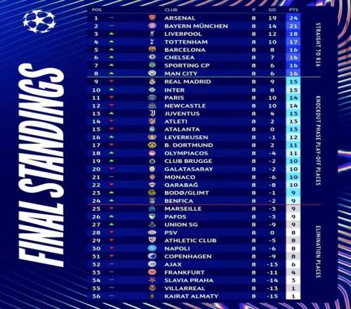 随着第八轮战罢,欧冠全新的联赛阶段排名尘埃落定,出现了多起令人意外的结局。