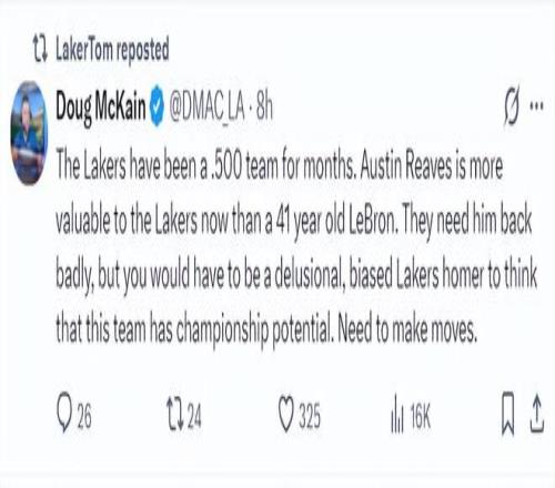 湖人记者Doug McKain赛后评论道:湖人已经连续数月胜率在50%,奥斯汀-里夫斯对湖人而言的重要性远超过41岁的詹姆斯,湖人迫切希望里夫斯回归,但你是个狂热的湖人球迷认为湖人一定要夺冠,那你一定是精神错乱或偏见了,因为这支球队根本没有夺冠实力,除非他们采取行动。